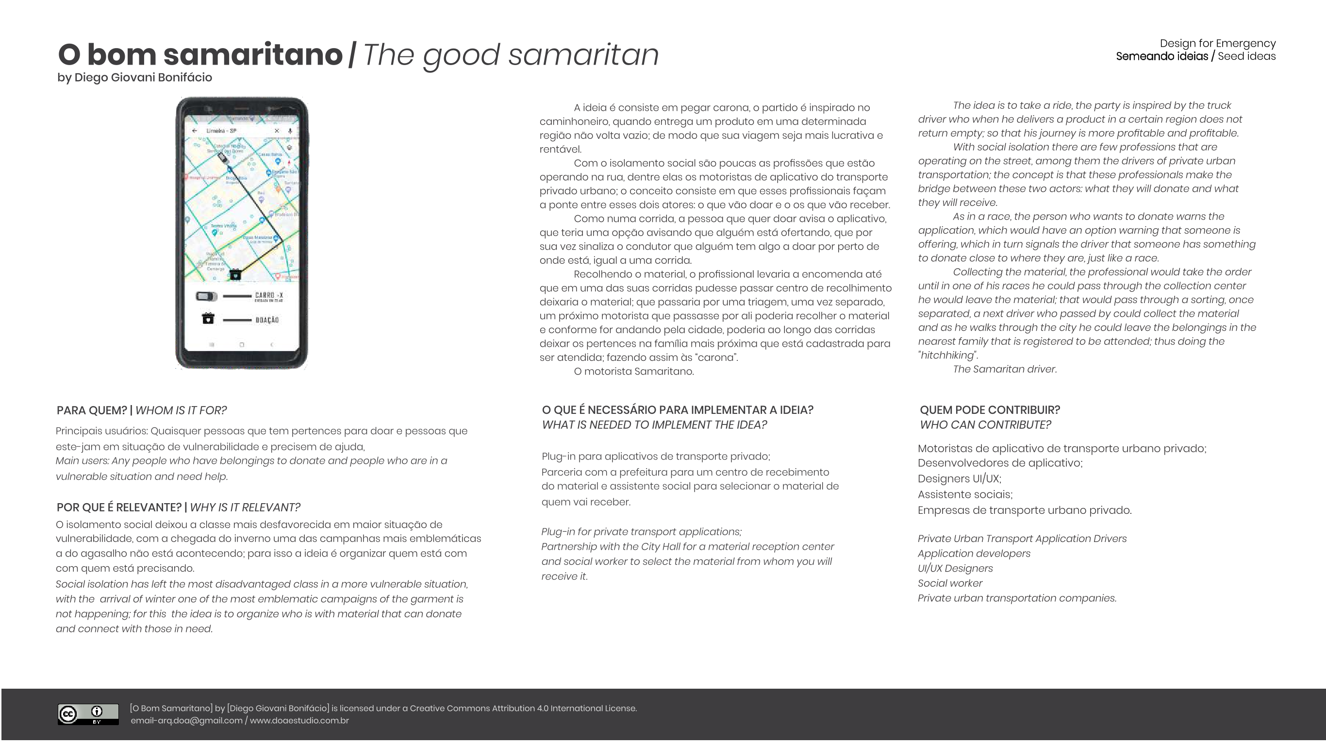 "A solução, chamada O Bom Samaritano, viria por meio de um plugin para aplicativos de carona já disponíveis no mercado. O aplicativo avisaria o motorista mais próximo que alguém tem algo para doar."