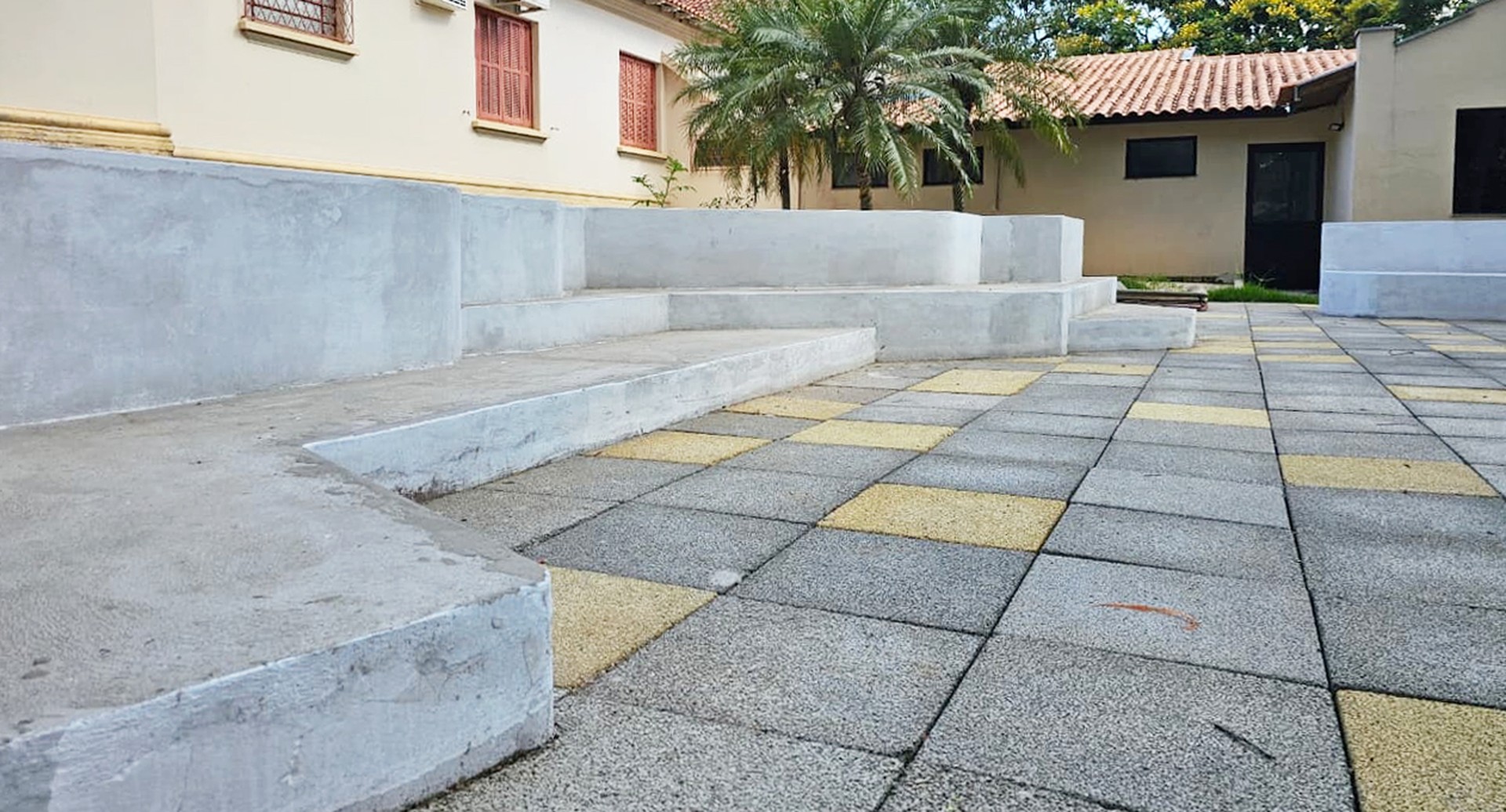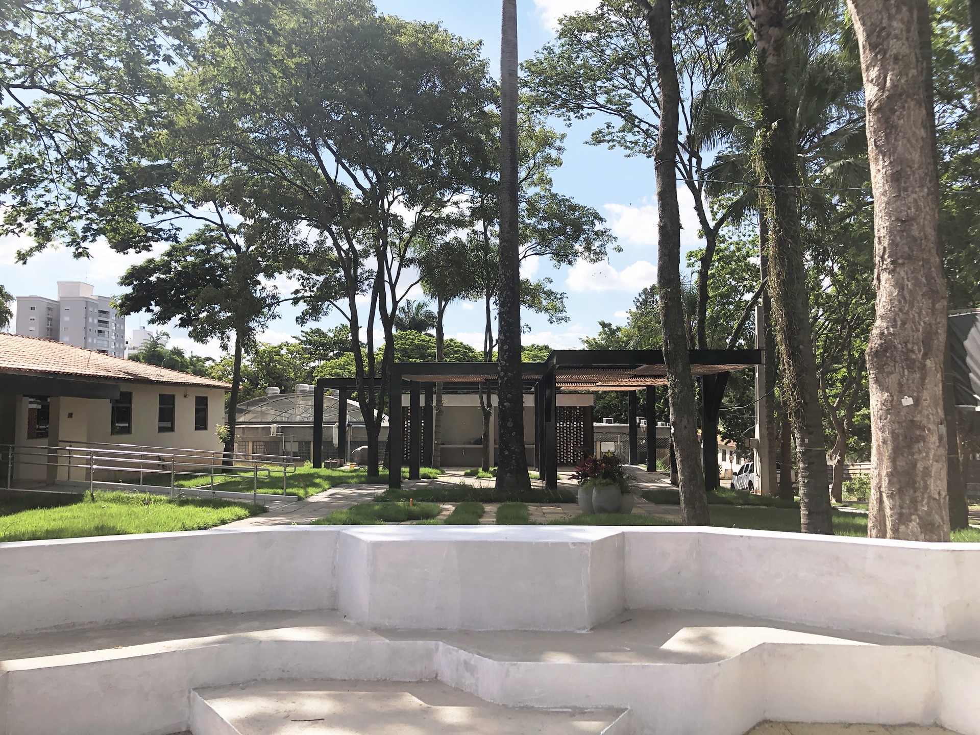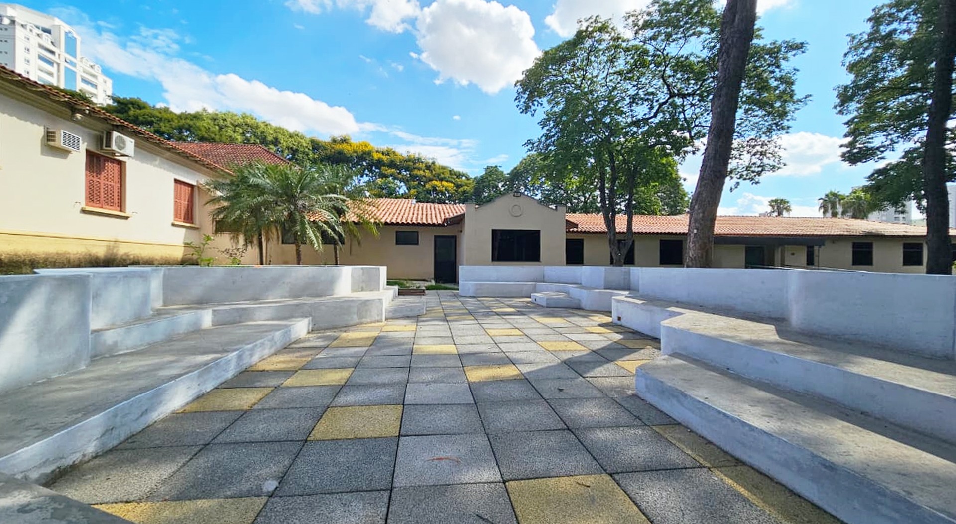O declive natural do terreno foi aproveitado para criar um anfiteatro ao ar livre, ideal para atividades culturais, rodas de conversa e aulas abertas. É um espaço escavado e acolhedor, que usa o relevo como parte do projeto arquitetônico e paisagístico.