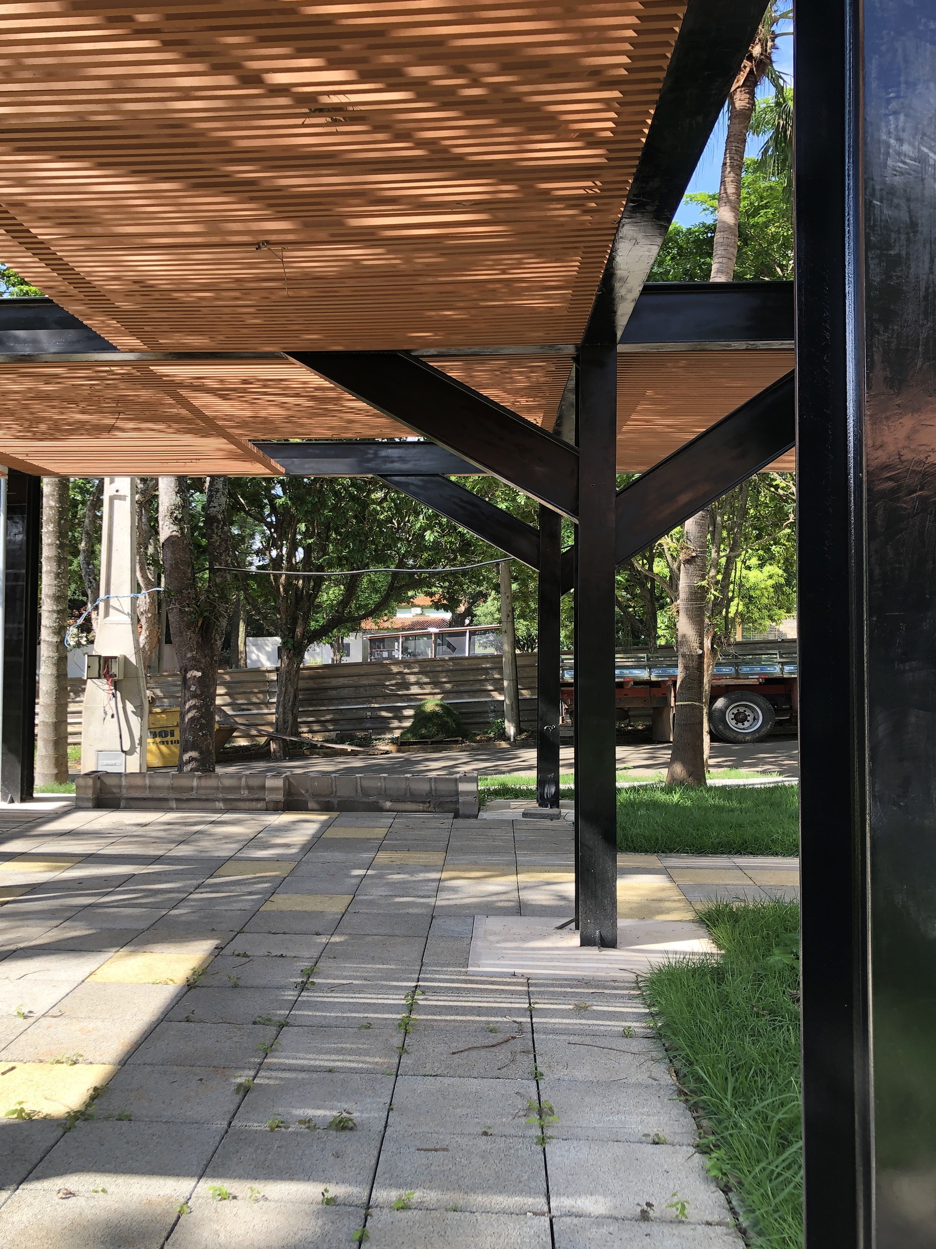 Sob pérgolas de madeira, o vazio assume protagonismo. É o coração do projeto — um lugar sem nome, como define Wisnik a partir de Flávio Motta.