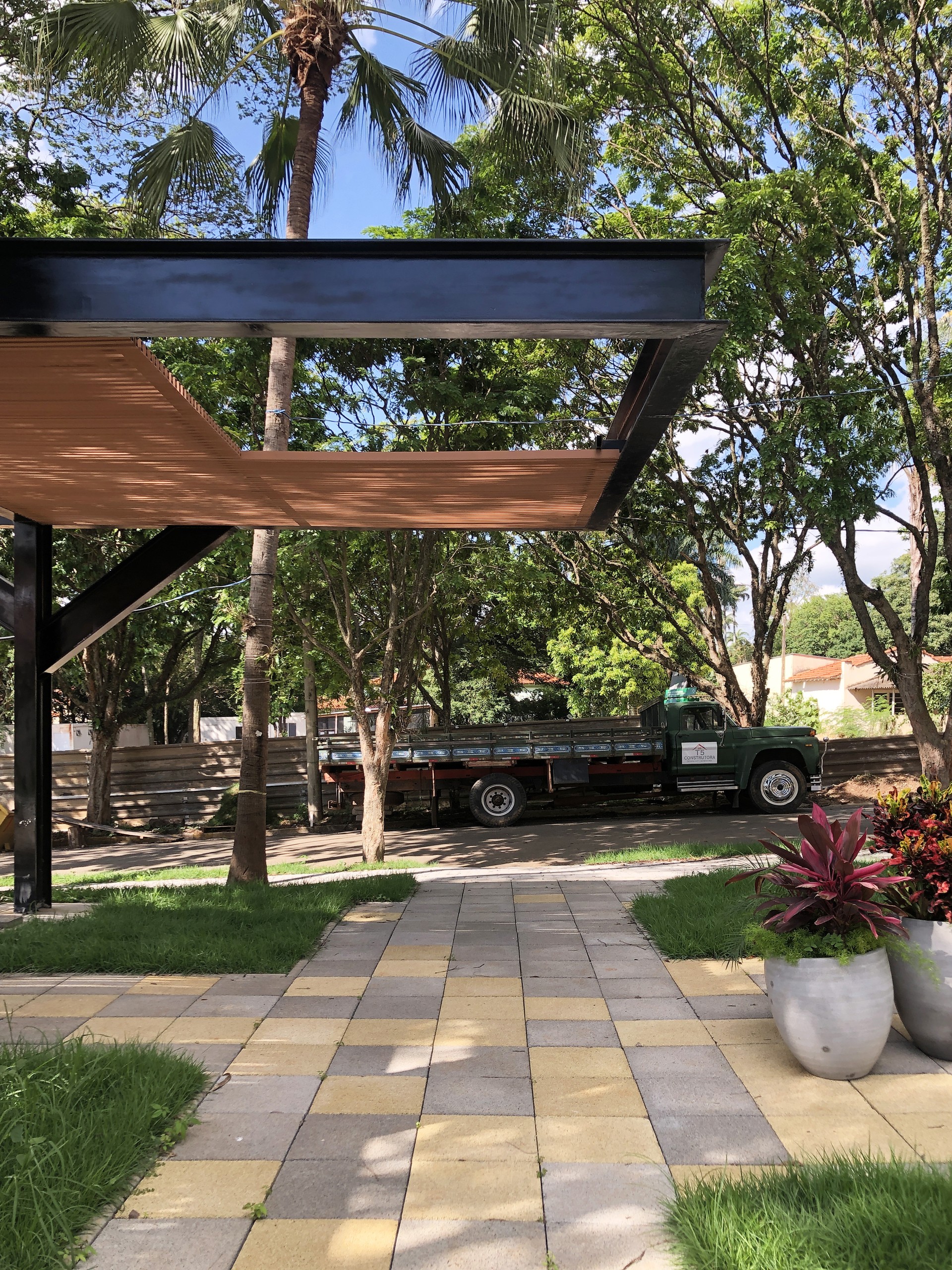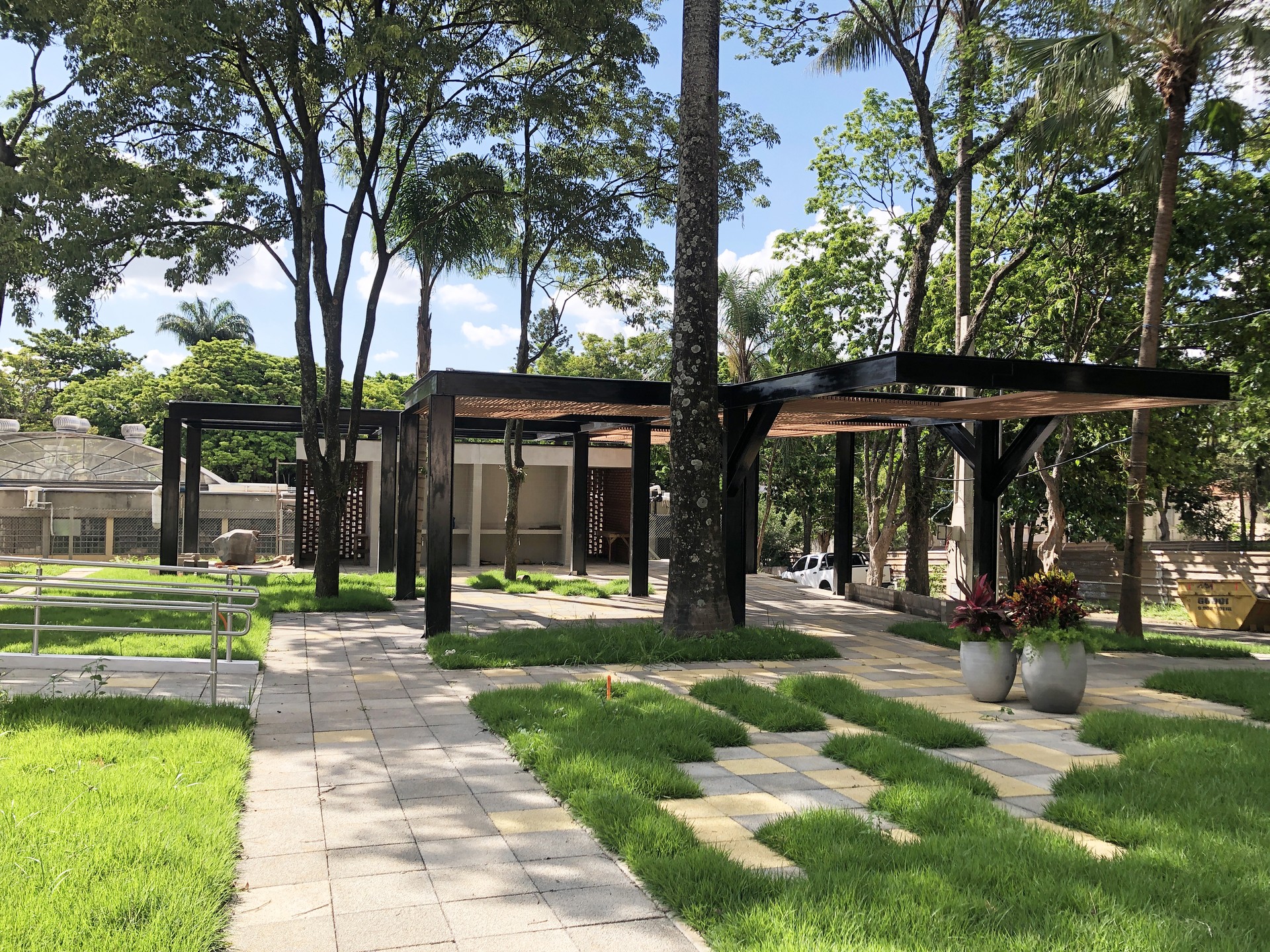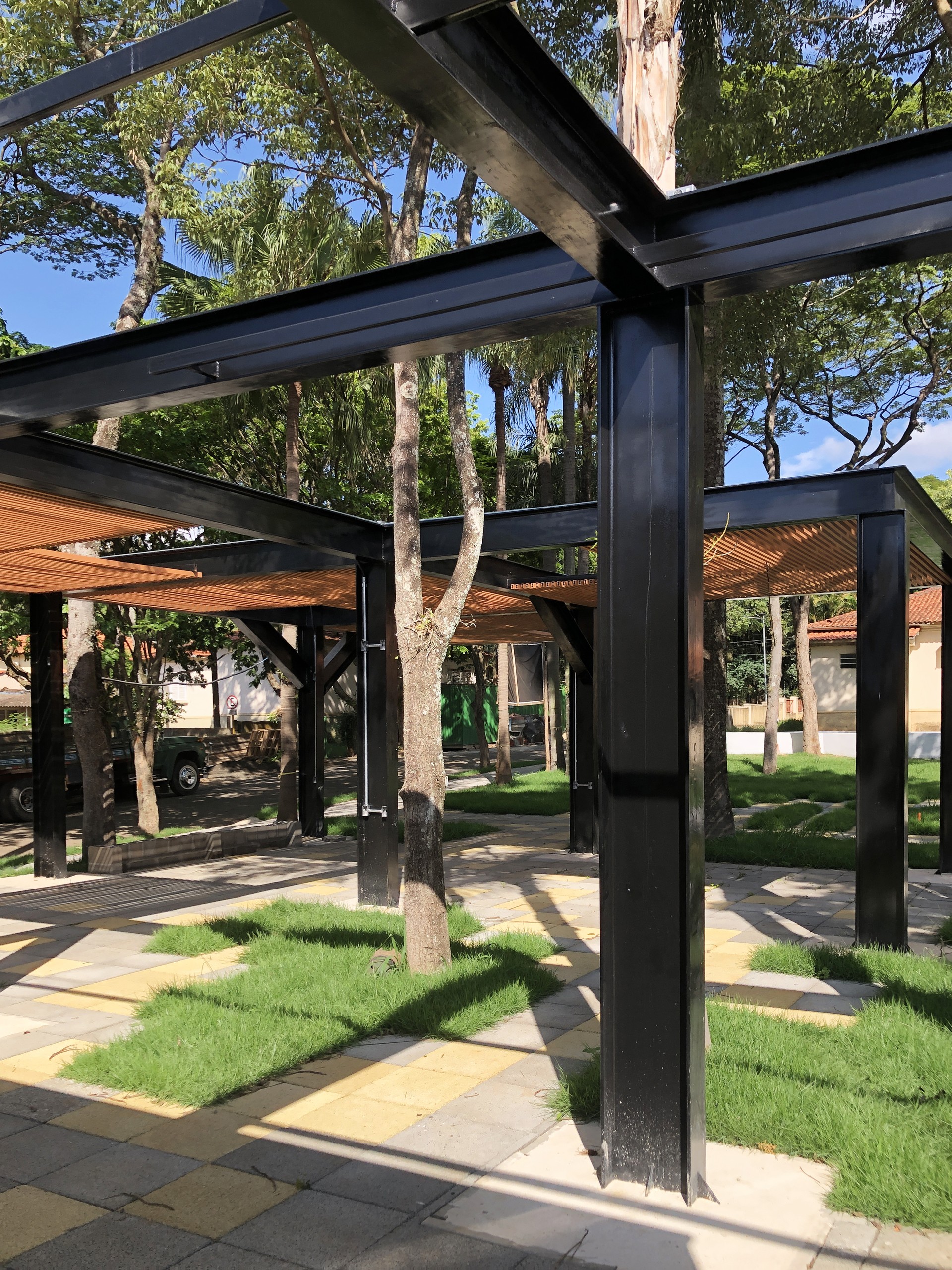 O preto da viga e o branco das edificações não competem com o verde. Pelo contrário: realçam a vegetação, tornam-na protagonista. A cor aqui não é expressão formal arbitrária — é escolha conceitual que dá protagonismo à natureza.